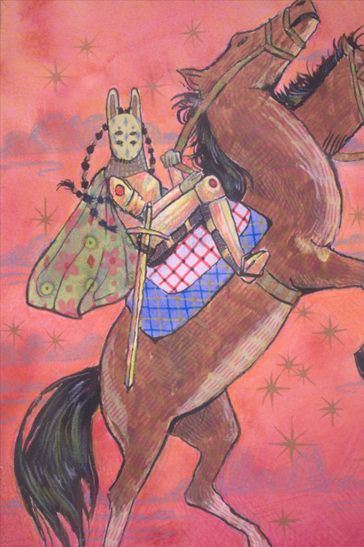 Though she wears a suit of armor, she also dons a rabbit mask. A prey animal, marking that despite her determination to create her own reality, she is still just a product of fate.